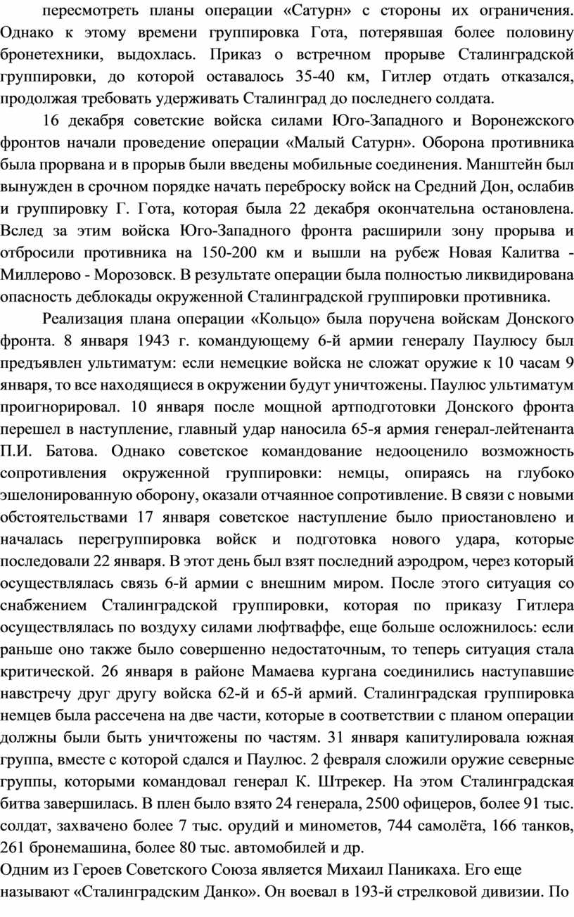 16 декабря советские войска силами Юго-Западного и Воронежского фронтов начали проведение операции «Малый Сатурн». Оборона противника была прорвана и в прорыв были введены мобильные соединения. Манштейн был вынужден в срочном порядке начать переброску войск на Средний Дон, ослабив и группировку Г. Гота, которая была 22 декабря окончательна остановлена. Вслед за этим войска Юго-Западного фронта расширили зону прорыва и отбросили противника на 150-200 км и вышли на рубеж Новая Калитва -Миллерово - Морозовск. В результате операции была полностью ликвидирована опасность деблокады окруженной Сталинградской группировки противника.