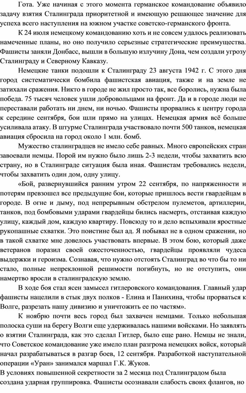 К ноябрю почти весь город был захвачен немцами. Только небольшая полоска суши на берегу Волги еще удерживалась нашими войсками. Но заявлять о взятии Сталинграда, как это сделал Гитлер, было еще рано. Немцы не знали, что Советское командование уже имело план разгрома немецких войск, который начал разрабатываться в разгар боев, 12 сентября. Разработкой наступательной операции «Уран» занимался маршал Г.К. Жуков.