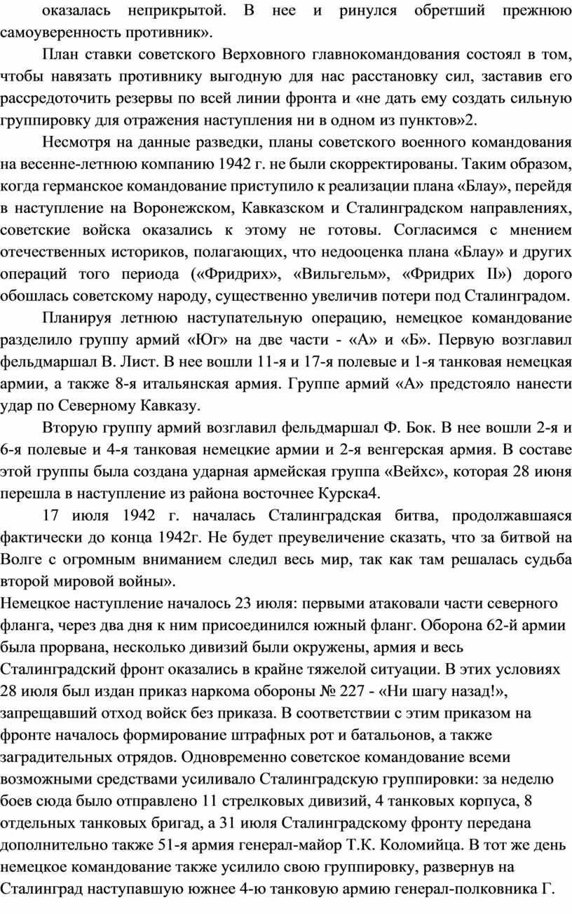 Несмотря на данные разведки, планы советского военного командования на весенне-летнюю компанию 1942 г. не были скорректированы. Таким образом, когда германское командование приступило к реализации плана «Блау», перейдя в наступление на Воронежском, Кавказском и Сталинградском направлениях, советские войска оказались к этому не готовы. Согласимся с мнением отечественных историков, полагающих, что недооценка плана «Блау» и других операций того периода («Фридрих», «Вильгельм», «Фридрих II») дорого обошлась советскому народу, существенно увеличив потери под Сталинградом.