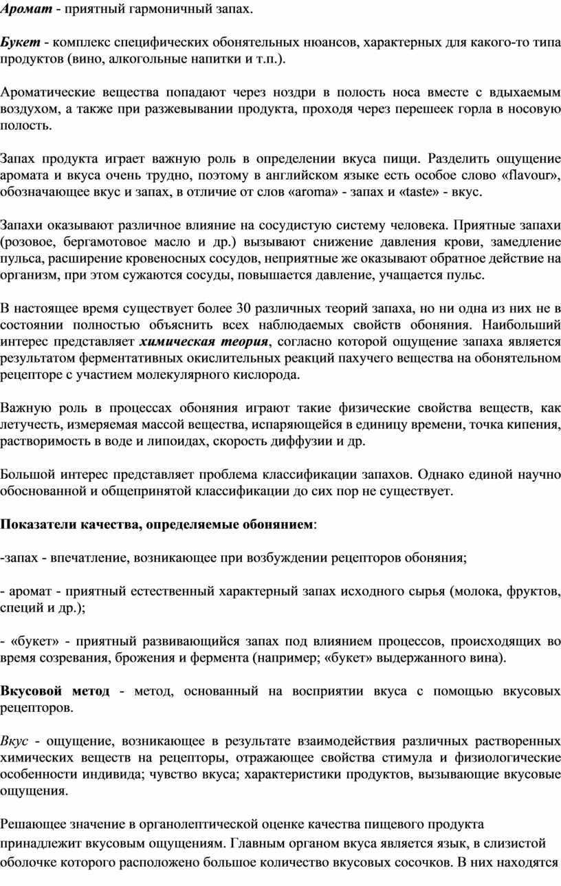Запах - органолептическая характеристика, воспринимаемая органом обоняния при вдыхании некоторых летучих ароматических веществ. Запах - впечатление, возникающее при возбуждении рецепторов обоняния, находящихся в полости носа. Наряду с запахом для пищевых продуктов применяют термины «аромат» и «букет».