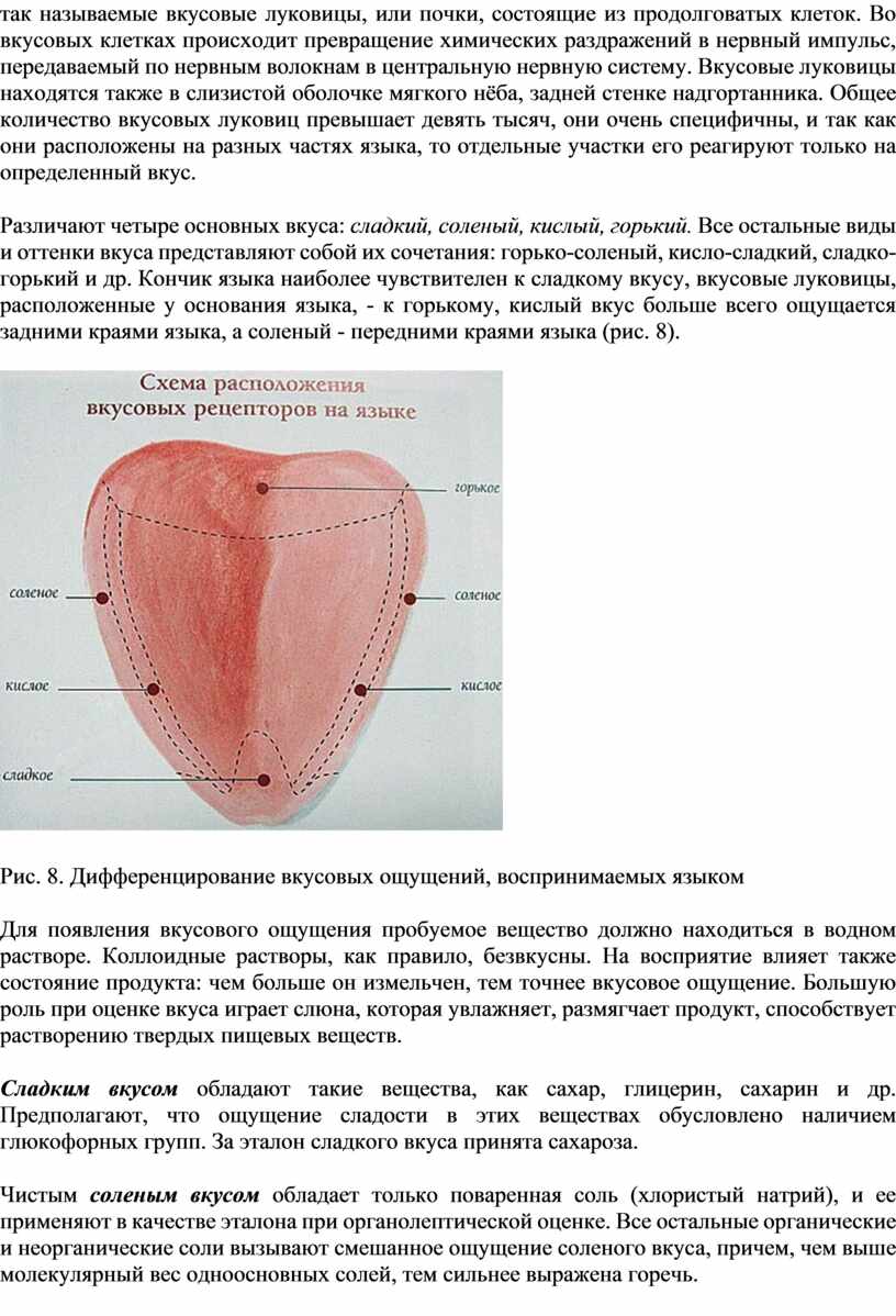 Решающее значение в органолептической оценке качества пищевого продукта принадлежит вкусовым ощущениям. Главным органом вкуса является язык, в слизистой оболочке которого расположено большое количество вкусовых сосочков. В них находятся так называемые вкусовые луковицы, или почки, состоящие из продолговатых клеток. Во вкусовых клетках происходит превращение химических раздражений в нервный импульс, передаваемый по нервным волокнам в центральную нервную систему. Вкусовые луковицы находятся также в слизистой оболочке мягкого нёба, задней стенке надгортанника. Общее количество вкусовых луковиц превышает девять тысяч, они очень специфичны, и так как они расположены на разных частях языка, то отдельные участки его реагируют только на определенный вкус.