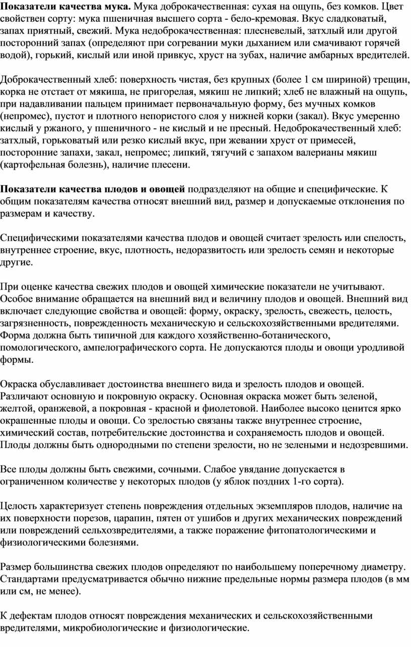 Специфическими показателями качества плодов и овощей считает зрелость или спелость, внутреннее строение, вкус, плотность, недоразвитость или зрелость семян и некоторые другие.