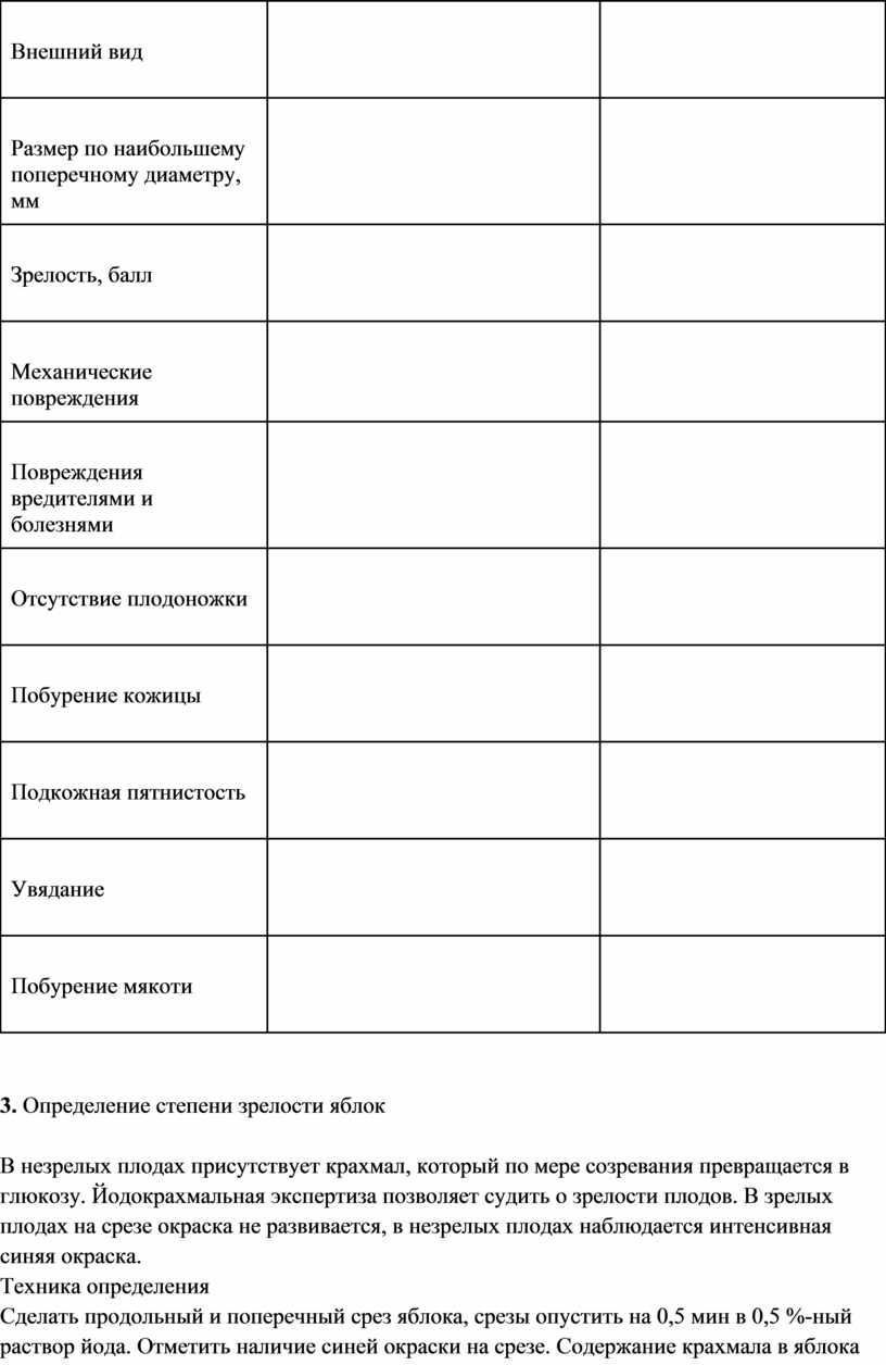 Сделать продольный и поперечный срез яблока, срезы опустить на 0,5 мин в 0,5 %-ный раствор йода. Отметить наличие синей окраски на срезе. Содержание крахмала в яблока выражается в баллах: