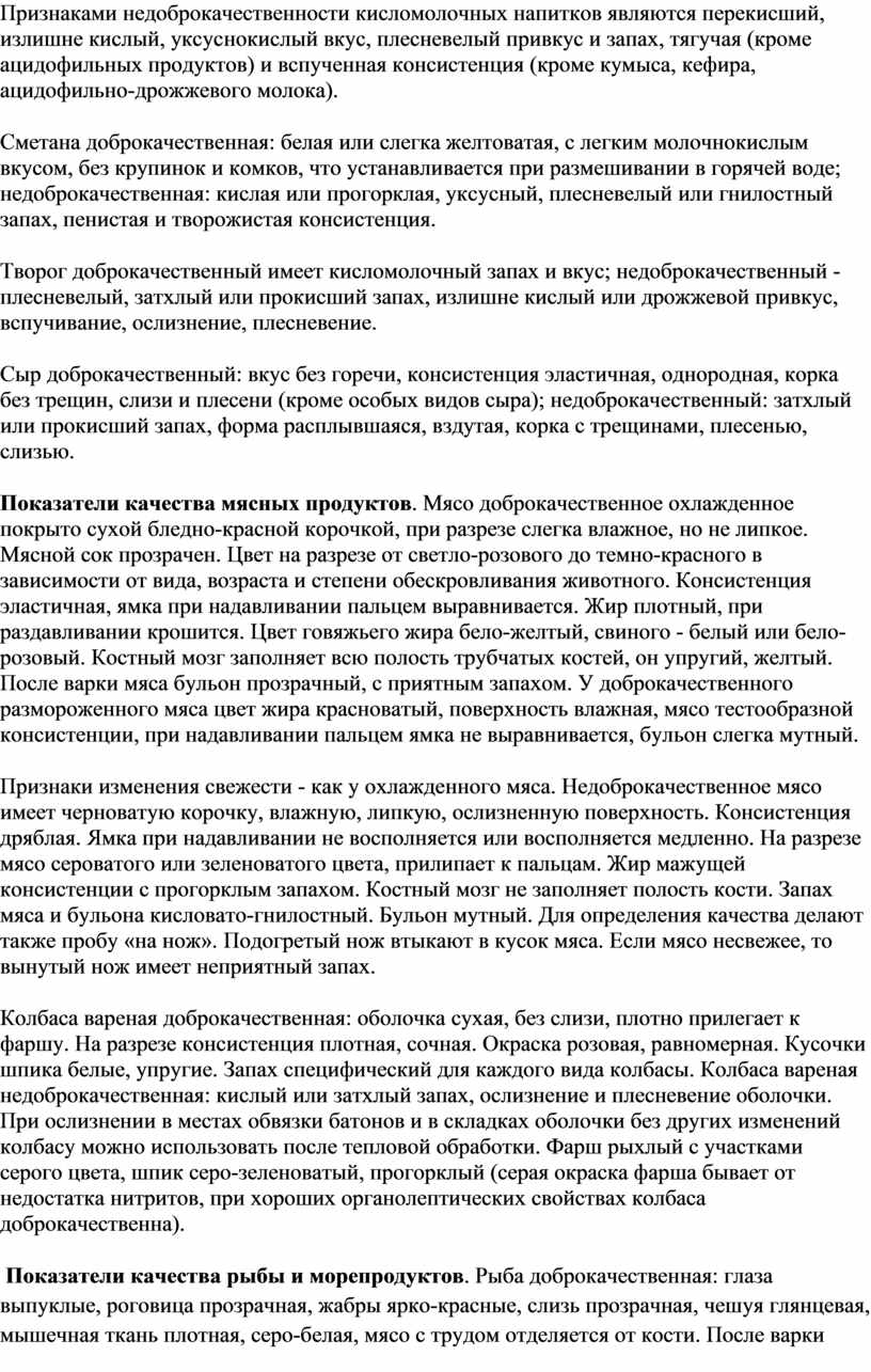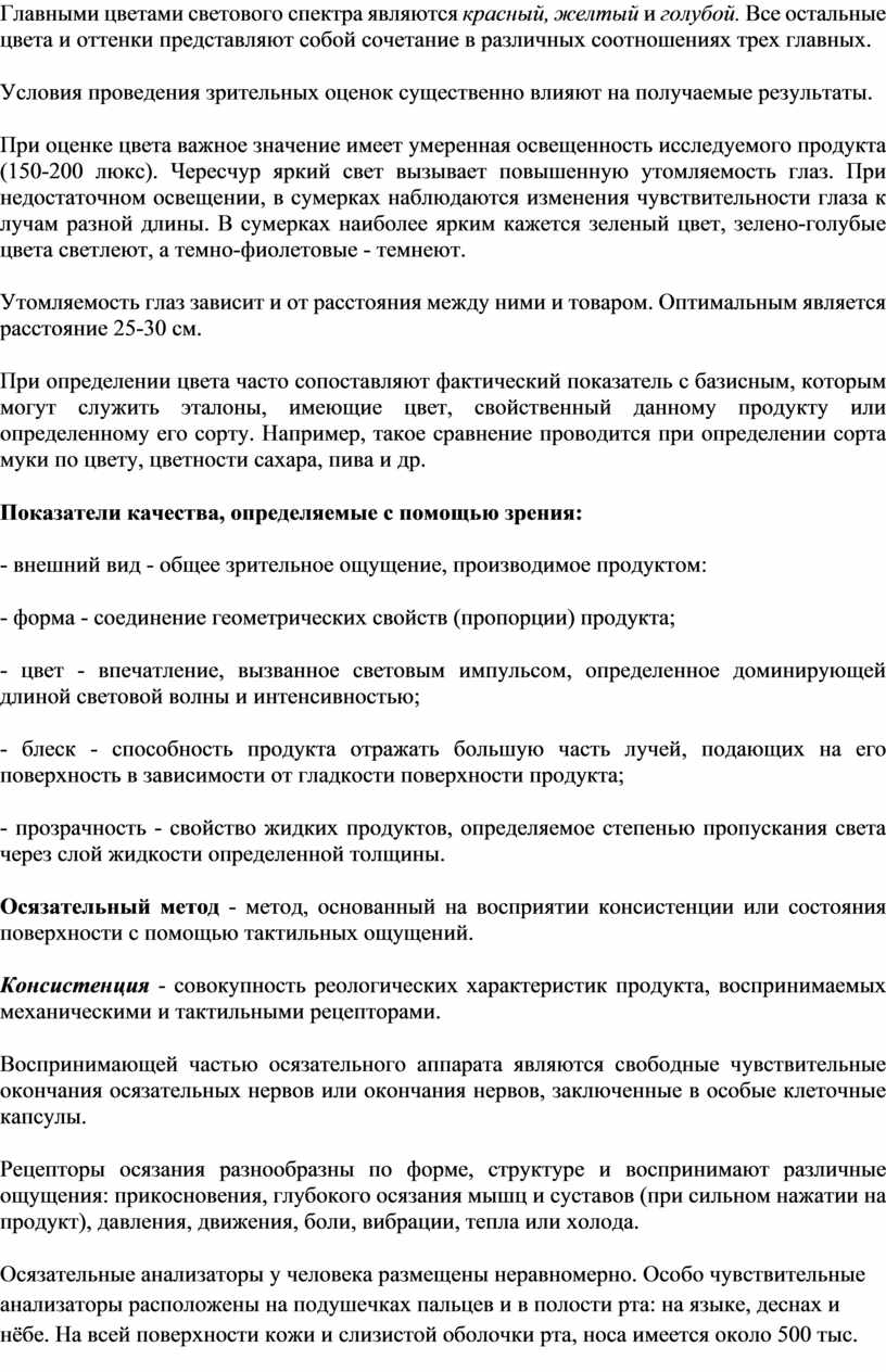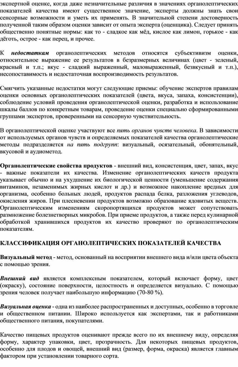 Органолептические свойства продуктов - внешний вид, консистенция, цвет, запах, вкус - важные показатели их качества. Изменение органолептических качеств продукта указывает обычно и на ухудшение их биологической ценности (уменьшение содержания витаминов, незаменимых жирных кислот и др.) и возможное накопление вредных для организма, особенно больных людей, продуктов распада белка, разложения углеводов, окисления жиров. При плесневении продуктов возможно образование ядовитых веществ. Органолептическим изменениям скоропортящихся продуктов может сопутствовать размножение болезнетворных микробов. При приеме продуктов, а также перед кулинарной обработкой хранившихся продуктов их качество проверяют по органолептическим показателям.