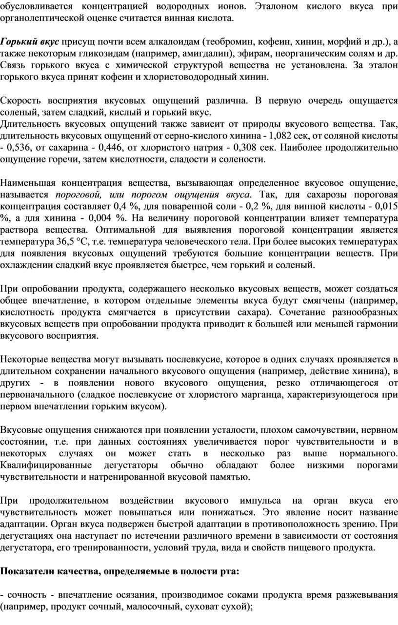 Наименьшая концентрация вещества, вызывающая определенное вкусовое ощущение, называется пороговой, или порогом ощущения вкуса. Так, для сахарозы пороговая концентрация составляет 0,4 %, для поваренной соли - 0,2 %, для винной кислоты - 0,015 %, а для хинина - 0,004 %. На величину пороговой концентрации влияет температура раствора вещества. Оптимальной для выявления пороговой концентрации является температура 36,5 °С, т.е. температура человеческого тела. При более высоких температурах для появления вкусовых ощущений требуются большие концентрации веществ. При охлаждении сладкий вкус проявляется быстрее, чем горький и соленый.