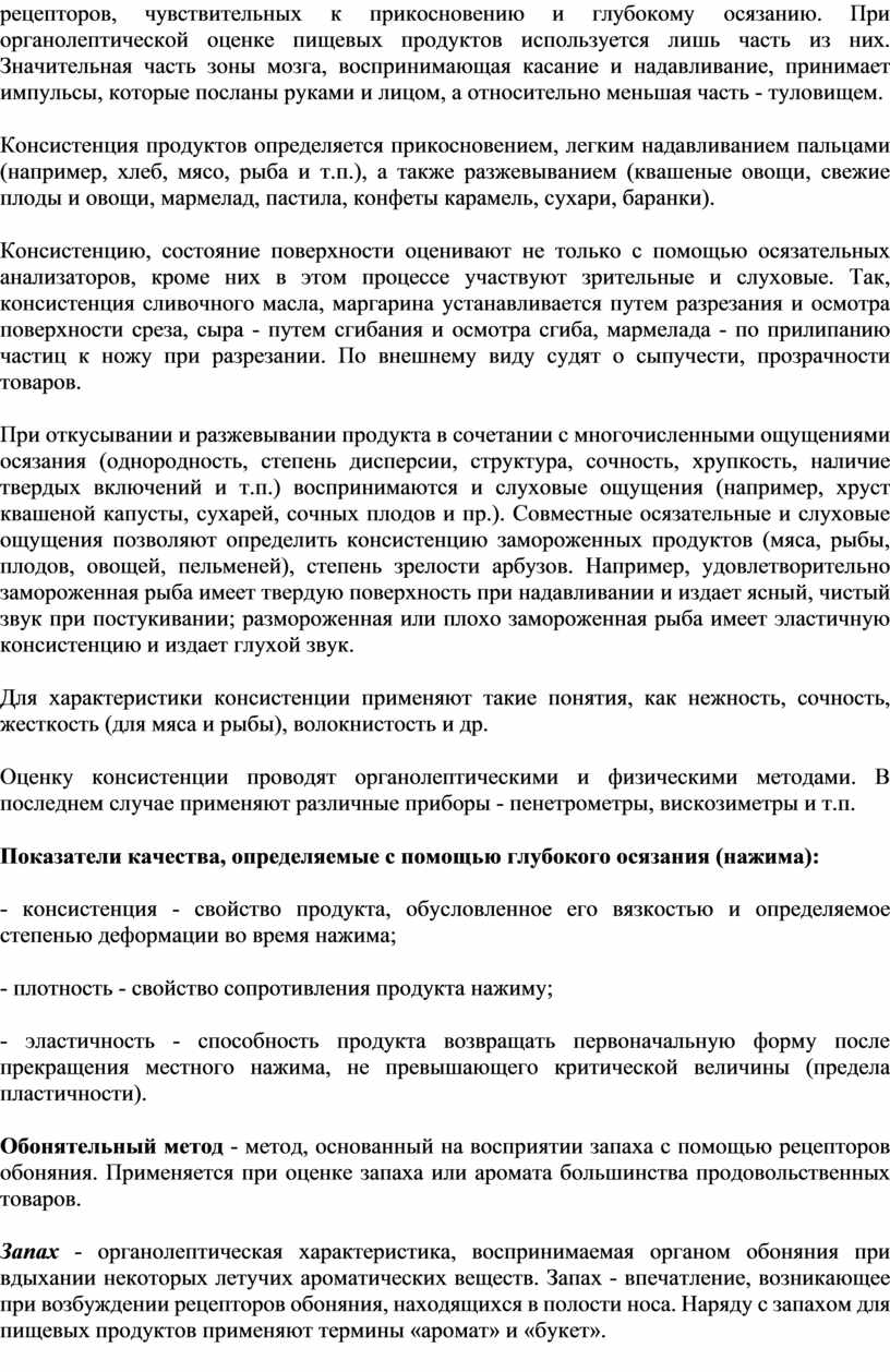 - консистенция - осязание, связанное с густотой, клейкостью продукта силой нажима; она чувствуется при распределении продукта на языке (консистенция жидкая, сиропообразная, густая, плотная);