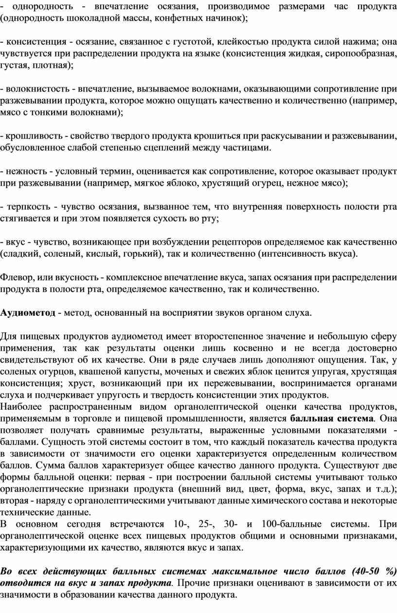 В основном сегодня встречаются 10-, 25-, 30- и 100-балльные системы. При органолептической оценке всех пищевых продуктов общими и основными признаками, характеризующими их качество, являются вкус и запах.