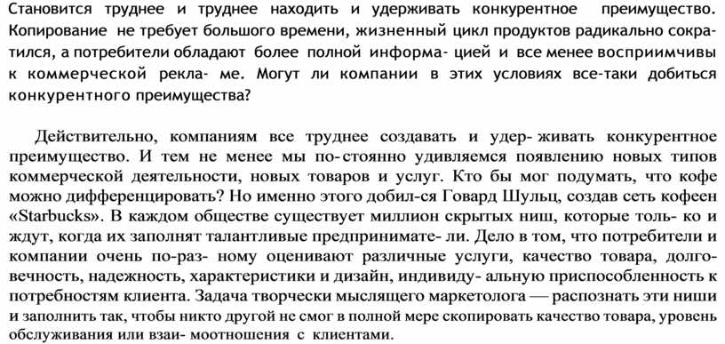 Действительно, компаниям все труднее создавать и удер живать конкурентное преимущество. И тем не менее мы по стоянно удивляемся появлению новых типов коммерческой деятельности, новых товаров и услуг. Кто бы мог подумать, что кофе можно дифференцировать? Но именно этого добил ся Говард Шульц, создав сеть кофеен «Starbucks». В каждом обществе существует миллион скрытых ниш, которые толь ко и ждут, когда их заполнят талантливые предпринимате ли. Дело в том, что потребители и компании очень по-раз ному оценивают различные услуги, качество товара, долго вечность, надежность, характеристики и дизайн, индивиду альную приспособленность к потребностям клиента. Задача творчески мыслящего маркетолога — распознать эти ниши и заполнить так, чтобы никто другой не смог в полной мере скопировать качество товара, уровень обслуживания или взаи моотношения с клиентами.