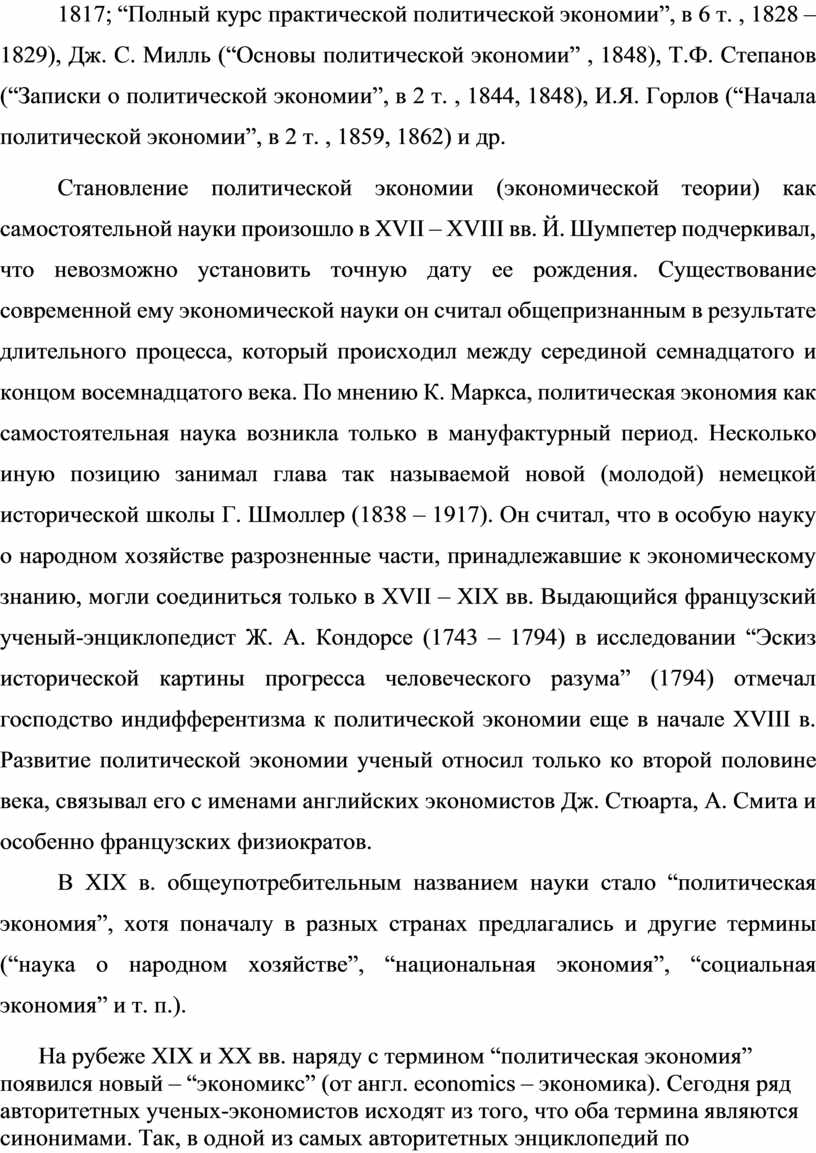 Дальнейшее развитие науки состояло в том, что за собственно экономической теорией, призванной изучать объективные экономические законы, четко закрепился выдвинутый ранее термин “политическая экономия”. Об этом свидетельствуют названия основных трудов таких ведущих экономистов, как Д. Рикардо (“Начала политической экономии и налогообложения”, 1817), С. Сисмон-ди (“Новые начала политической экономии”, 1819), Ж. Б. Сей (“Трактат по политической экономии”, в 2 т., 1803; “Катехизис политической экономии”, 1817; “Полный курс практической политической экономии”, в 6 т. , 1828 – 1829), Дж. С. Милль (“Основы политической экономии” , 1848), Т.Ф. Степанов (“Записки о политической экономии”, в 2 т. , 1844, 1848), И.Я. Горлов (“Начала политической экономии”, в 2 т. , 1859, 1862) и др.