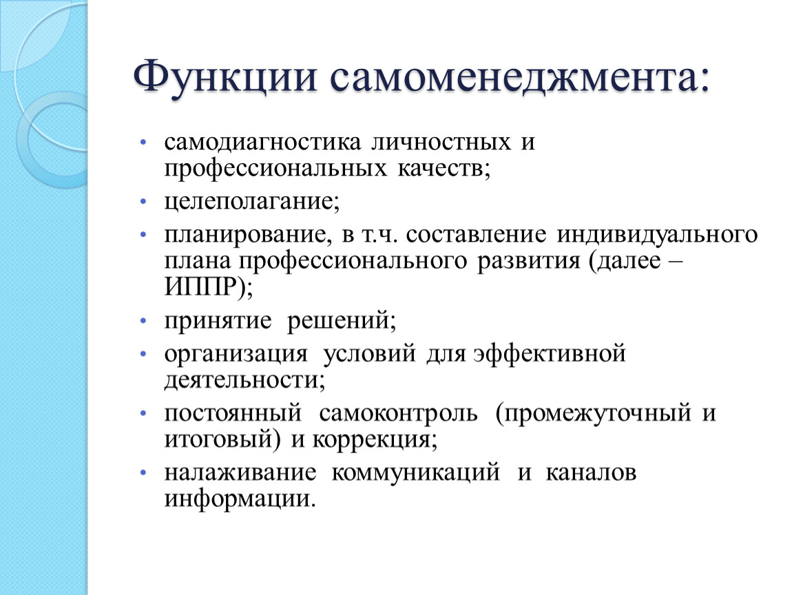 Персональный менеджмент (англ, selfmanagment — самоменедж-мент) — эффективное управление своим личностным и профессиональным развитием для эффективности выполнения социально значимой деятельности, развития карьеры, реализации индивидуальных проектов, принятия решений, эффективных коммуникаций и урегулировании конфликтов.