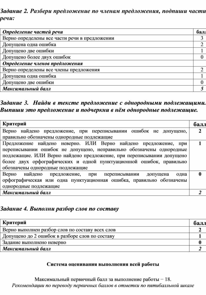 Задания 2 и 3 предполагают знание основных языковых единиц. Эти задания нацелены на выявление уровня владения обучающимися базовыми учебно-языковыми опознавательными умениями. Задание 2 проверяет умение распознавать и подчеркивать однородные члены в предложении (учебно- языковое синтаксическое опознавательное умение); задание 3 (п. 1) – умение распознавать и графически обозначать главные и второстепенные члены предложения, задание 3 (п. 2) – умение распознавать изученные части речи в предложении (учебно- языковое морфологическое опознавательное умение).