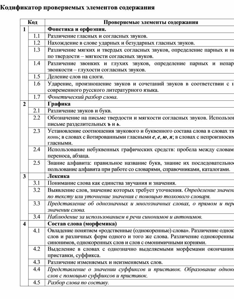 – «Фонетика. Графика», «Лексика», «Состав слова», «Морфология»,