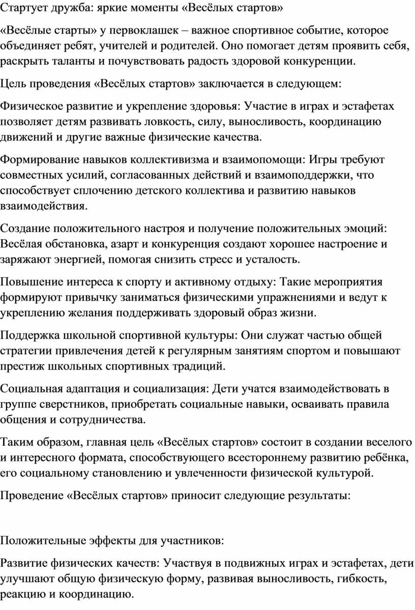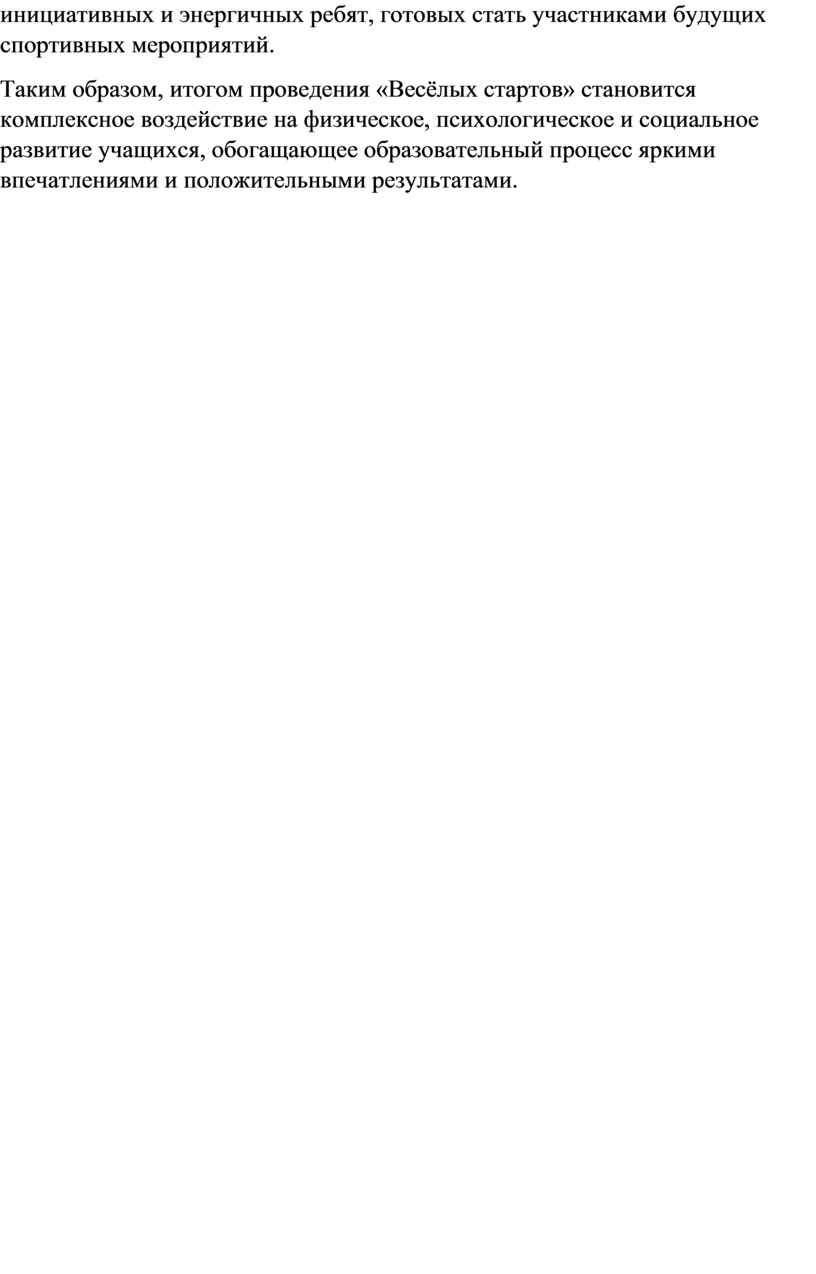 Таким образом, итогом проведения «Весёлых стартов» становится комплексное воздействие на физическое, психологическое и социальное развитие учащихся, обогащающее образовательный процесс яркими впечатлениями и положительными результатами.