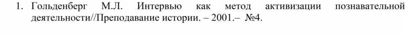 3. Гольденберг М.Л. Интервью как метод активизации познавательной деятельности//Преподавание истории. – 2001.– №4.