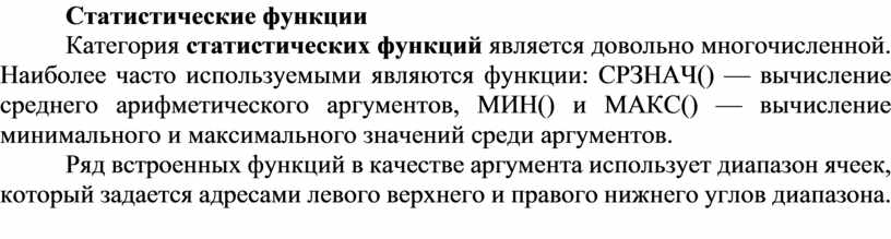 Категория статистических функций является довольно многочисленной. Наиболее часто используемыми являются функции: СРЗНАЧ() — вычисление среднего арифметического аргументов, МИН() и МАКС() — вычисление минимального и максимального значений среди аргументов.