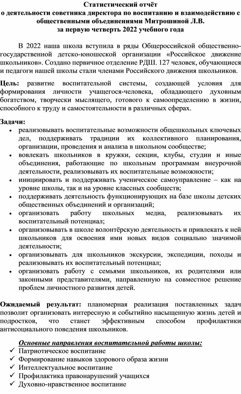 о деятельности советника директора по воспитанию и взаимодействию с общественными объединениями Митрошиной Л.В.