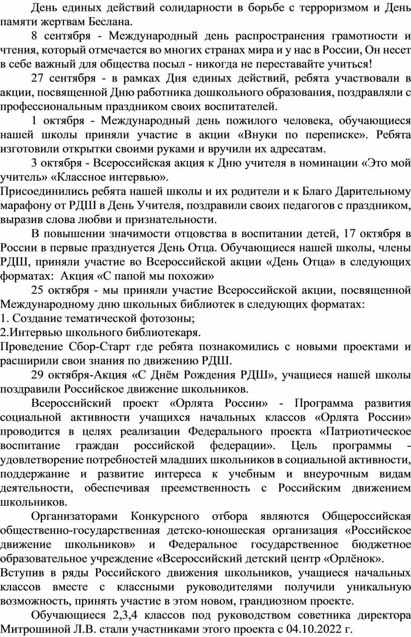 В 2022 наша школа вступила в ряды Общероссийской общественно-государственной детско-юношеской организации «Российское движение школьников». Создано первичное отделение РДШ. 127 человек, обучающиеся и педагоги нашей школы стали членами Российского движения школьников.