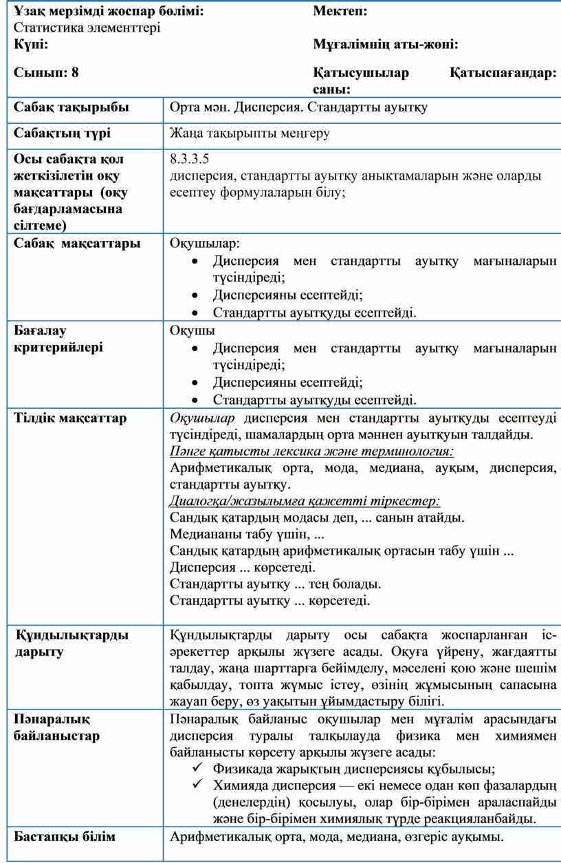 Оқушылар дисперсия мен стандартты ауытқуды есептеуді түсіндіреді, шамалардың орта мәннен ауытқуын талдайды. Пәнге қатысты лексика және терминология: Арифметикалық орта, мода, медиана, ауқым, дисперсия, стандартты ауытқу. Диалогқа/жазылымға қажетті тіркестер: Сандық қатардың модасы деп, ... санын атайды. Медиананы табу үшін, ... Сандық қатардың арифметикалық ортасын табу үшін ... Дисперсия ... көрсетеді. Стандартты ауытқу ... тең болады. Стандартты ауытқу ... көрсетеді.