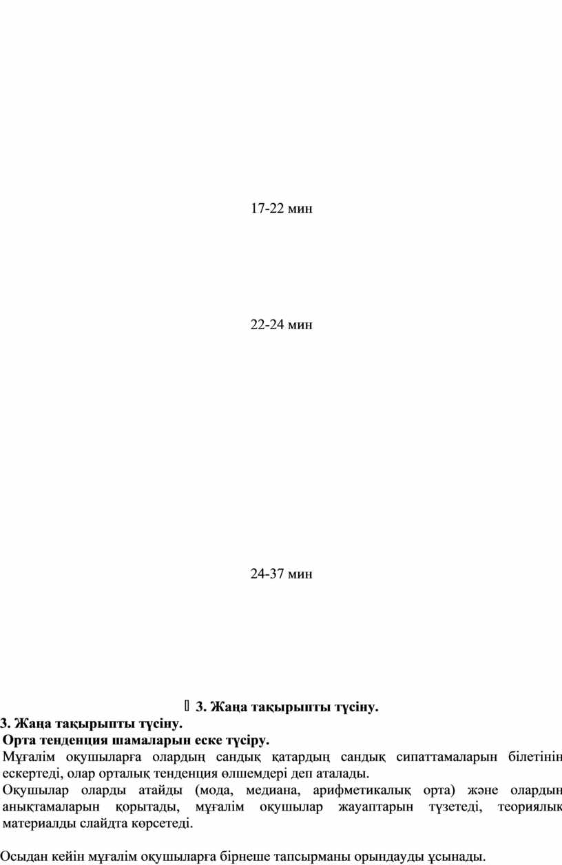 3. Жаңа тақырыпты түсіну. Орта тенденция шамаларын еске түсіру. Мұғалім оқушыларға олардың сандық қатардың сандық сипаттамаларын білетінін ескертеді, олар орталық тенденция өлшемдері деп аталады. Оқушылар оларды атайды (мода, медиана, арифметикалық орта) және олардың анықтамаларын қорытады, мұғалім оқушылар жауаптарын түзетеді, теориялық материалды слайдта көрсетеді.
