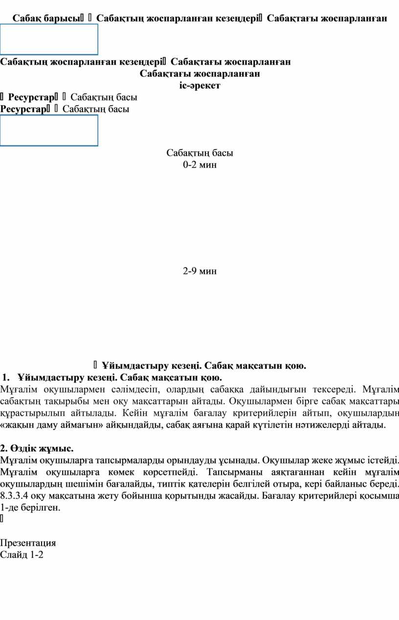 2. Өздік жұмыс. Мұғалім оқушыларға тапсырмаларды орындауды ұсынады. Оқушылар жеке жұмыс істейді. Мұғалім оқушыларға көмек көрсетпейді. Тапсырманы аяқтағаннан кейін мұғалім оқушылардың шешімін бағалайды, типтік қателерін белгілей отыра, кері байланыс береді. 8.3.3.4 оқу мақсатына жету бойынша қорытынды жасайды. Бағалау критерийлері қосымша 1-де берілген.