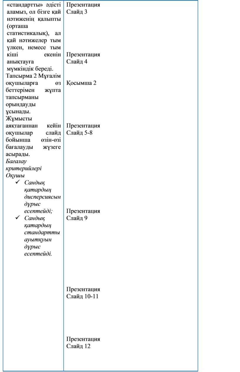 5. Дисперсия мен стандартты ауытқуды есептеуге арналған тапсырмалар. Тапсырма 1-ді оқушылар мұғаліммен бірге шығарады, осы мысалдың негізінде мұғалім стандартты ауытқудың не үшін керектігін түсіндіреді. Мұғалім: «Дисперсияның бір кемшілігі бар: егер берілген шамалар қандай да бір бірлікпен өлшенсе (мысалы, тенгемен), онда дисперсияда бұл бірліктер квадратқа алынады («квадраттық» тенге). Одан арылу үшін, шашыраңдылықтың басқа сипаттамасын қолдануға болады – стандартты ауытқу. Стандартты ауытқу деп дисперсияның квадрат түбірі алынады. Стандартты ауытқудың өзінде маңызды ақпарат бар. Енді біз өлшеудің нәтижелерінің қайсысы интервал аралығында жататынын анықтай аламыз. Ол үшін арифметикалық ортадан екі жаққа стандартты ауытқуды аламыз. Яғни стандартты ауытқу көмегімен біз «стандартты» әдісті аламыз, ол бізге қай нәтиженің қалыпты (орташа статистикалық), ал қай нәтижелер тым үлкен, немесе тым кіші екенін анықтауға мүмкіндік береді. Тапсырма 2 Мұғалім оқушыларға өз беттерімен жұпта тапсырманы орындауды ұсынады. Жұмысты аяқтағаннан кейін оқушылар слайд бойынша өзін-өзі бағалауды жүзеге асырады. Бағалау критерийлері Оқушы ü Сандық қатардың дисперсиясын дұрыс есептейді; ü Сандық қатардың стандартты ауытқуын дұрыс есептейді. |