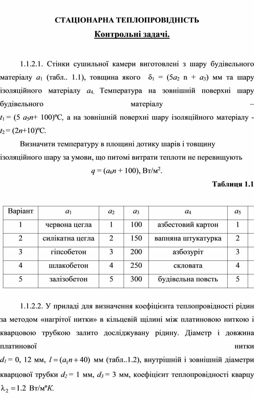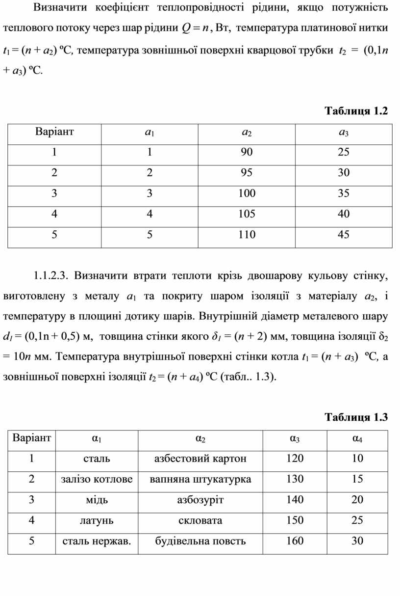 1.1.2.3. Визначити втрати теплоти крізь двошарову кульову стінку, виготовлену з металу а1 та покриту шаром ізоляції з матеріалу а2, і температуру в площині дотику шарів. Внутрішній діаметр металевого шару d1 = (0,1n + 0,5) м, товщина стінки якого δ1 = (n + 2) мм, товщина ізоляції δ2 = 10n мм. Температура внутрішньої поверхні стінки котла t1 = (n + а3) ºC, а зовнішньої поверхні ізоляції t2 = (n + а4) ºC (табл.. 1.3).