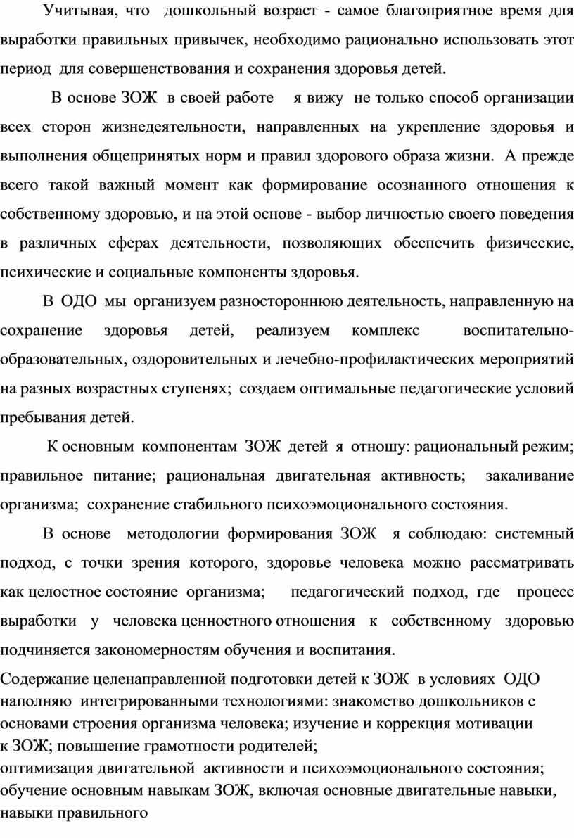 Содержание целенаправленной подготовки детей к ЗОЖ в условиях ОДО наполняю интегрированными технологиями: знакомство дошкольников с основами строения организма человека; изучение и коррекция мотивации к ЗОЖ; повышение грамотности родителей; оптимизация двигательной активности и психоэмоционального состояния; обучение основным навыкам ЗОЖ, включая основные двигательные навыки, навыки правильного дыхания, навыки закаливания, основные гигиенические навыки, основы самомассажа; профилактика и коррекция нарушений опорно-двигательного аппарата; основы психической саморегуляции; профессиональная подготовка и самообразование специалистов ОДО.