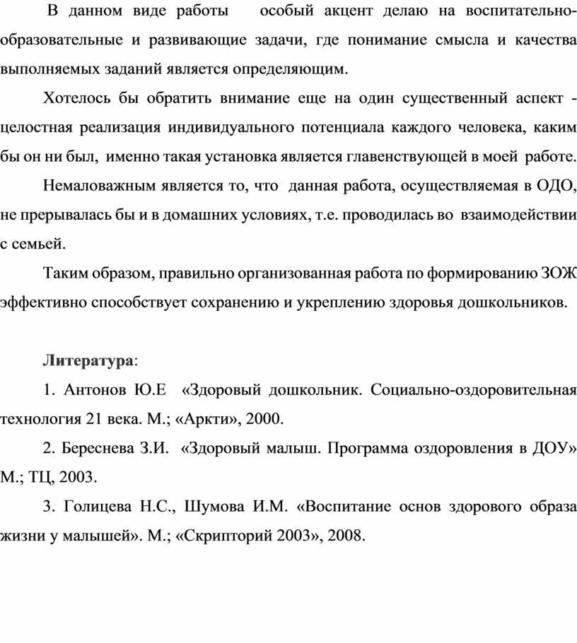 1. Антонов Ю.Е «Здоровый дошкольник. Социально-оздоровительная технология 21 века. М.; «Аркти», 2000.