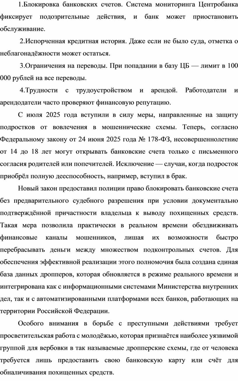 Особого внимания в борьбе с преступными действиями требует просветительская работа с молодёжью, которая признаётся наиболее уязвимой группой для вербовки в так называемые дропперские схемы, где от человека требуется лишь предоставить свою банковскую карту или счёт для обналичивания похищенных средств.