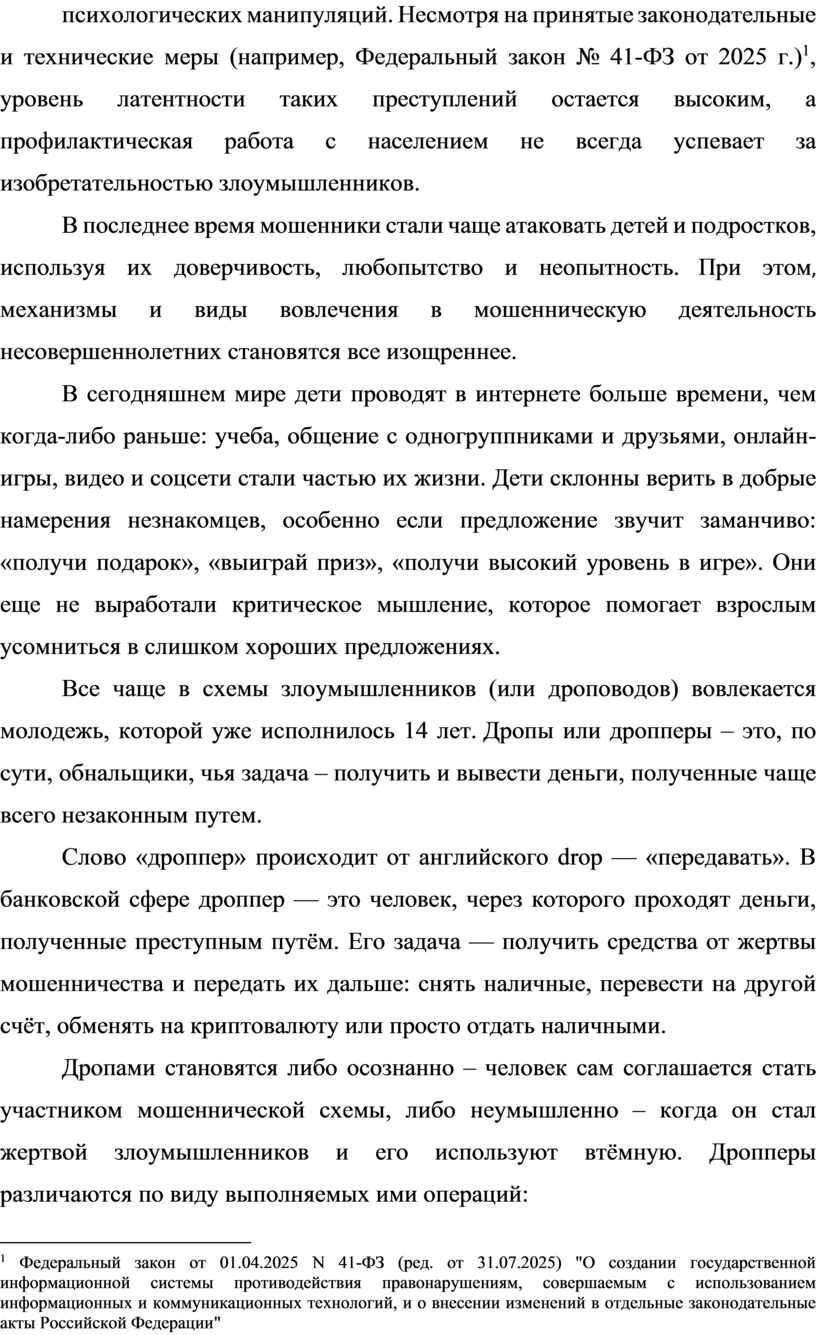 Преступные механизмы постоянно эволюционируют: от примитивных финансовых пирамид до псевдоброкерских платформ и многоходовых психологических манипуляций. Несмотря на принятые законодательные и технические меры (например, Федеральный закон № 41-ФЗ от 2025 г.)[1], уровень латентности таких преступлений остается высоким, а профилактическая работа с населением не всегда успевает за изобретательностью злоумышленников.