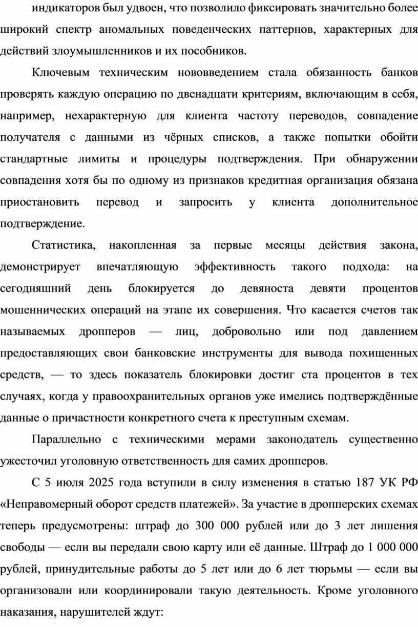 Статистика, накопленная за первые месяцы действия закона, демонстрирует впечатляющую эффективность такого подхода: на сегодняшний день блокируется до девяноста девяти процентов мошеннических операций на этапе их совершения. Что касается счетов так называемых дропперов — лиц, добровольно или под давлением предоставляющих свои банковские инструменты для вывода похищенных средств, — то здесь показатель блокировки достиг ста процентов в тех случаях, когда у правоохранительных органов уже имелись подтверждённые данные о причастности конкретного счета к преступным схемам.