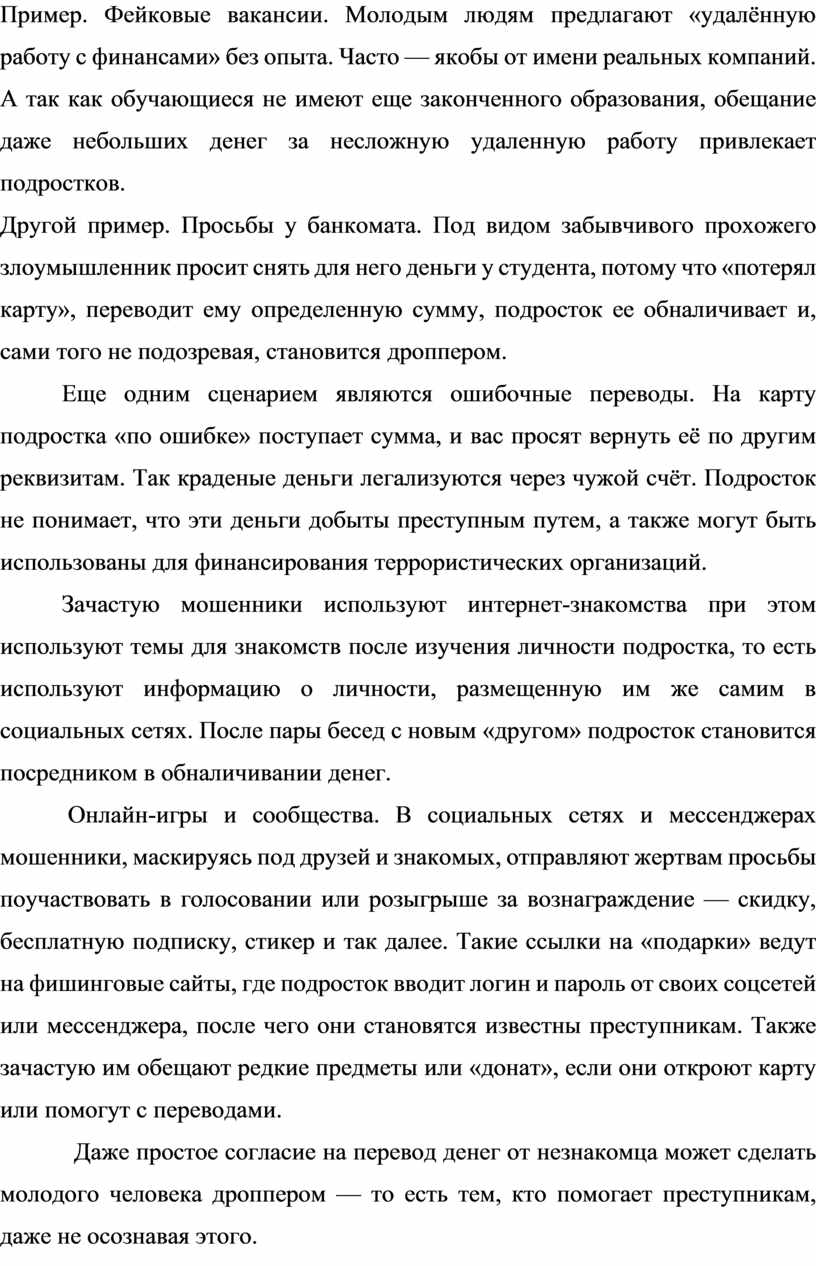Пример. Фейковые вакансии. Молодым людям предлагают «удалённую работу с финансами» без опыта. Часто — якобы от имени реальных компаний. А так как обучающиеся не имеют еще законченного образования, обещание даже небольших денег за несложную удаленную работу привлекает подростков.