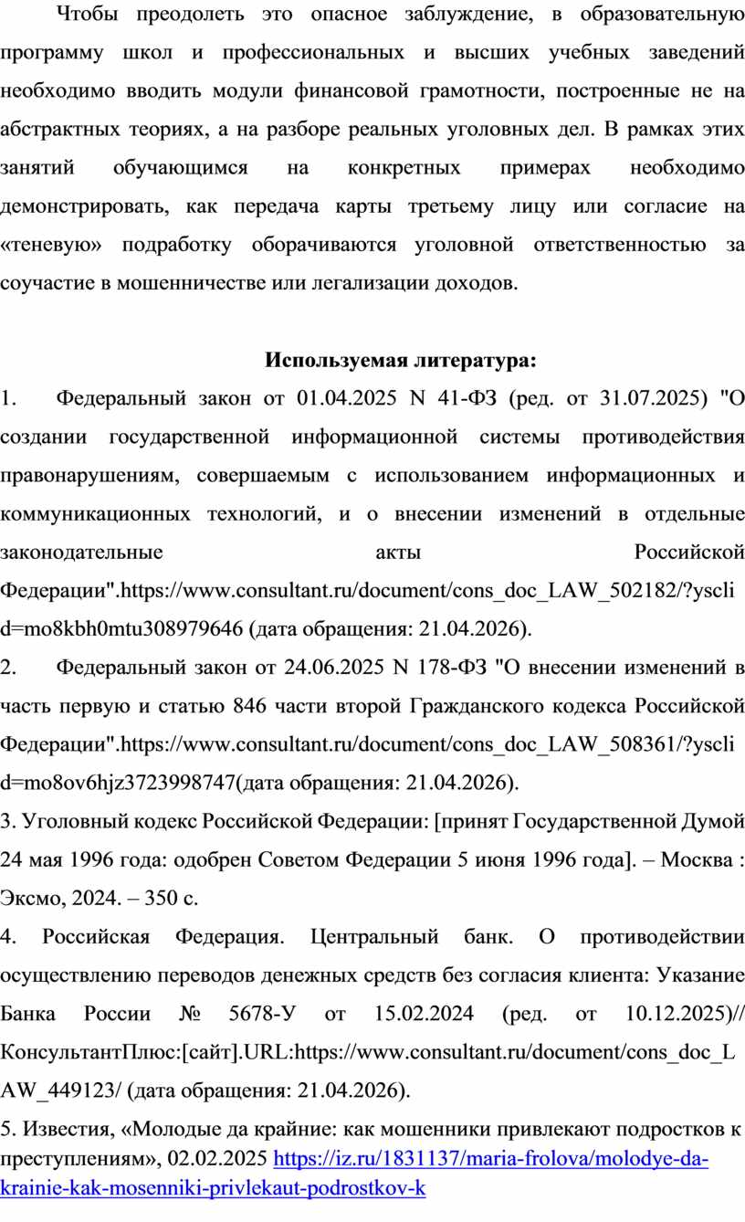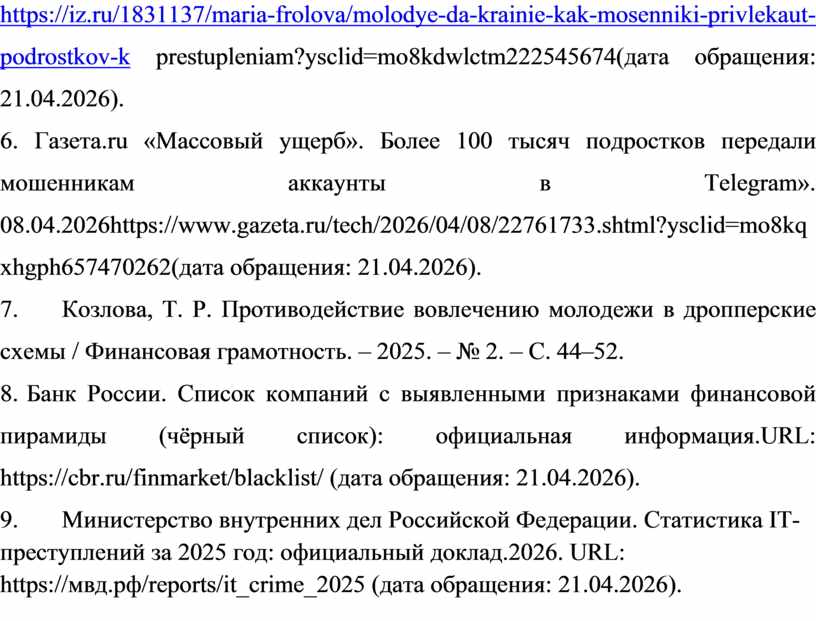 5. Известия, «Молодые да крайние: как мошенники привлекают подростков к преступлениям», 02.02.2025 https://iz.ru/1831137/maria-frolova/molodye-da-krainie-kak-mosenniki-privlekaut-podrostkov-k prestupleniam?ysclid=mo8kdwlctm222545674(дата обращения: 21.04.2026).