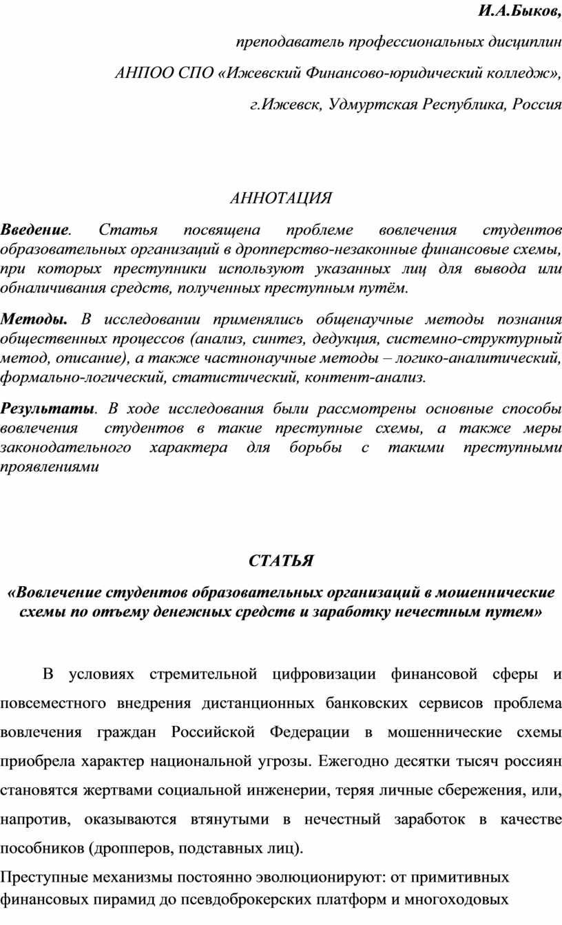Введение. Статья посвящена проблеме вовлечения студентов образовательных организаций в дропперство-незаконные финансовые схемы, при которых преступники используют указанных лиц для вывода или обналичивания средств, полученных преступным путём.