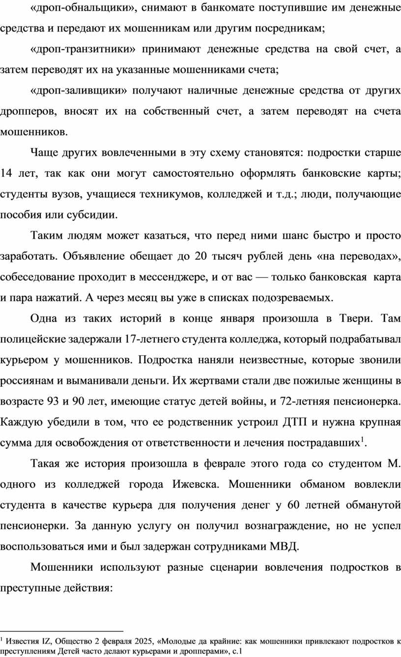 [2] Известия IZ, Общество 2 февраля 2025, «Молодые да крайние: как мошенники привлекают подростков к преступлениям Детей часто делают курьерами и дропперами», с.1