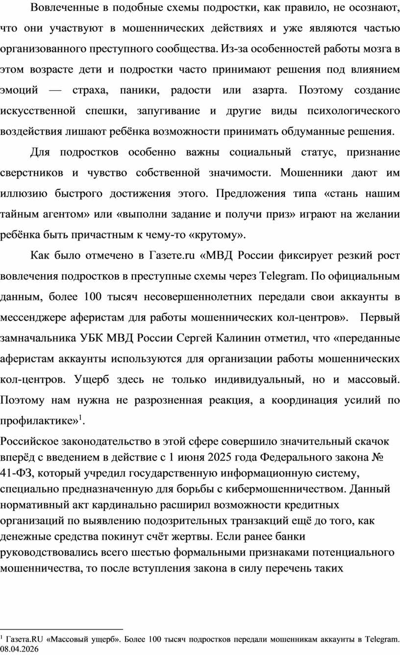 [3] Газета.RU «Массовый ущерб». Более 100 тысяч подростков передали мошенникам аккаунты в Telegram. 08.04.2026