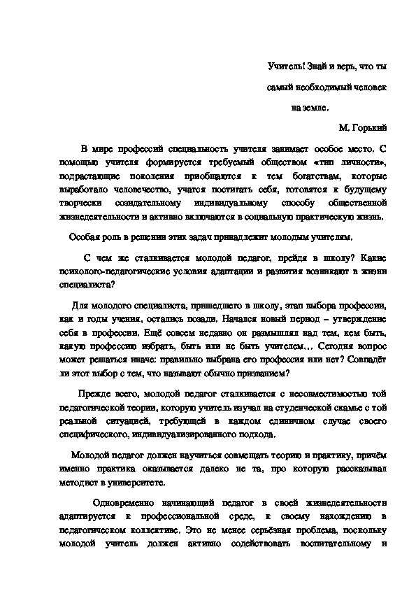 Статья - рассуждение молодого педагога на тему: "Психолого-педагогические основы условия адаптации