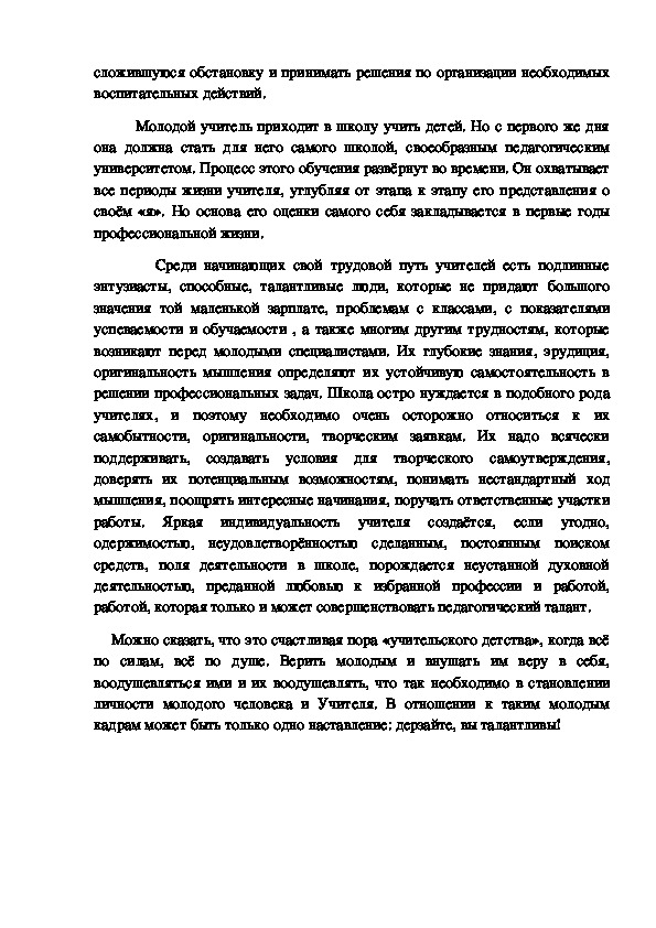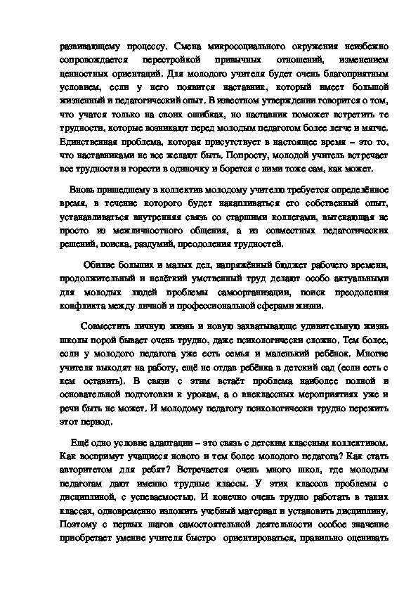 молодой учитель должен активно содействовать воспитательному иразвивающему процессу. Смена микросоциального окружения неизбежно
