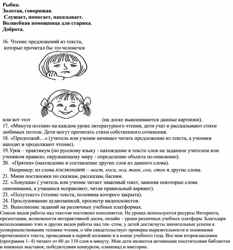 Список видов работы над текстом постоянно пополняется. На уроках используются ресурсы Интернета, презентации, возможности интерактивной доски, онлайн – уроки различных учебных платформ. Благодаря использованию этих и других видов работы над тек- стом, у детей достигнуты значительные успехи в усовершенствовании техники чтения, о чём свидетельствует проверка выразительности и понимания прочитанного текста, проводимая в первой половине и в конце учебного года. Все мои второклассники (программа 1- 4) читают от 60 до 110 слов в минуту. Мои дети являются активными посетителями библиотек и книжных выставок, победителями конкурсов, олимпиад и викторин.