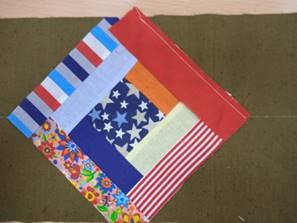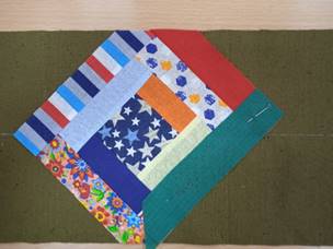 Далее последовательно к сторонам по очереди прикладываем и притачиваем полоски выбранных цветов до получения полного квадрата с уголками на размеченных линиях.