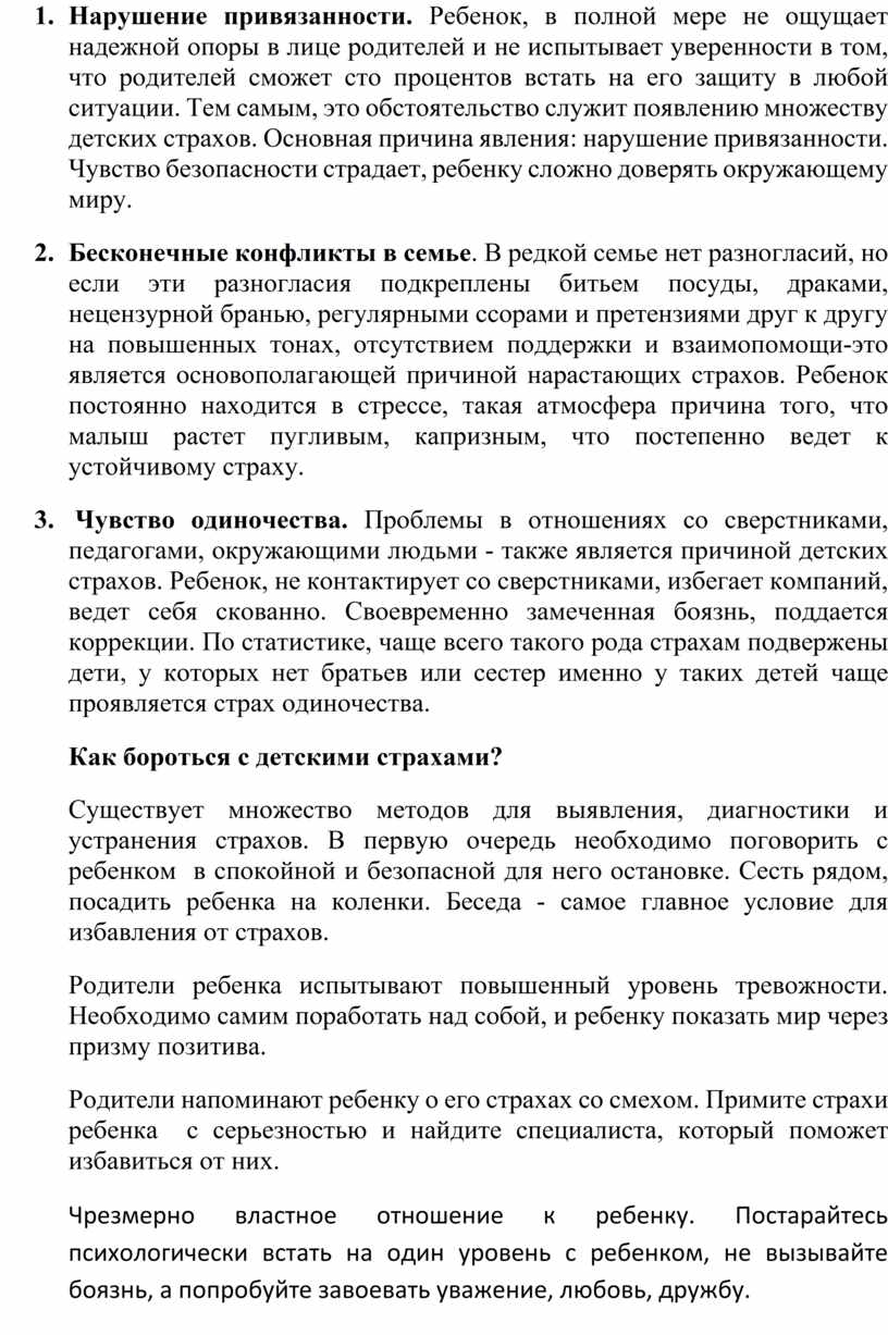 8. Нарушение привязанности. Ребенок, в полной мере не ощущает надежной опоры в лице родителей и не испытывает уверенности в том, что родителей сможет сто процентов встать на его защиту в любой ситуации. Тем самым, это обстоятельство служит появлению множеству детских страхов. Основная причина явления: нарушение привязанности. Чувство безопасности страдает, ребенку сложно доверять окружающему миру.