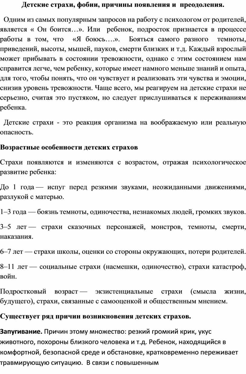 Детские страхи, фобии, причины появления и преодоления.