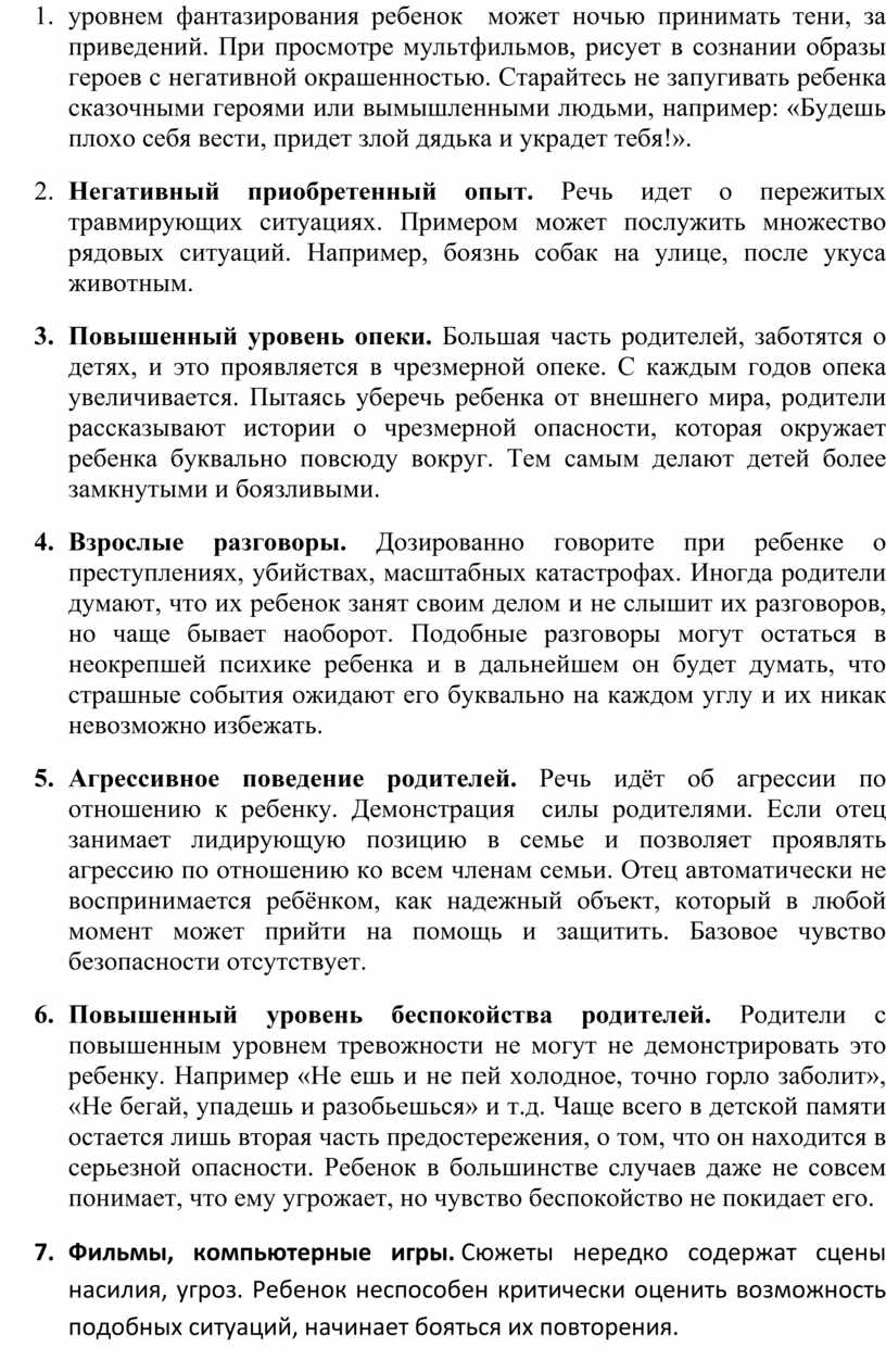 7. Фильмы, компьютерные игры. Сюжеты нередко содержат сцены насилия, угроз. Ребенок неспособен критически оценить возможность подобных ситуаций, начинает бояться их повторения.