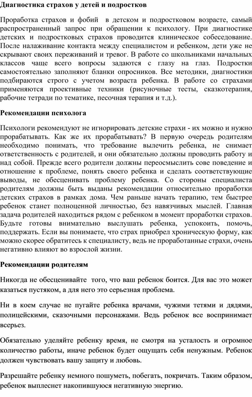 Проработка страхов и фобий в детском и подростковом возрасте, самый распространенный запрос при обращении к психологу. При диагностике детских и подростковых страхов проводится клиническое собеседование. После налаживание контакта между специалистом и ребенком, дети уже не скрывают своих переживаний и тревог. В работе со школьниками начальных классов чаще всего вопросы задаются с глазу на глаз. Подростки самостоятельно заполняют бланки опросников. Все методики, диагностики подбираются строго с учетом возраста ребенка. В работе со страхами применяются проективные техники (рисуночные тесты, сказкотерапия, рабочие тетради по тематике, песочная терапия и т.д.).