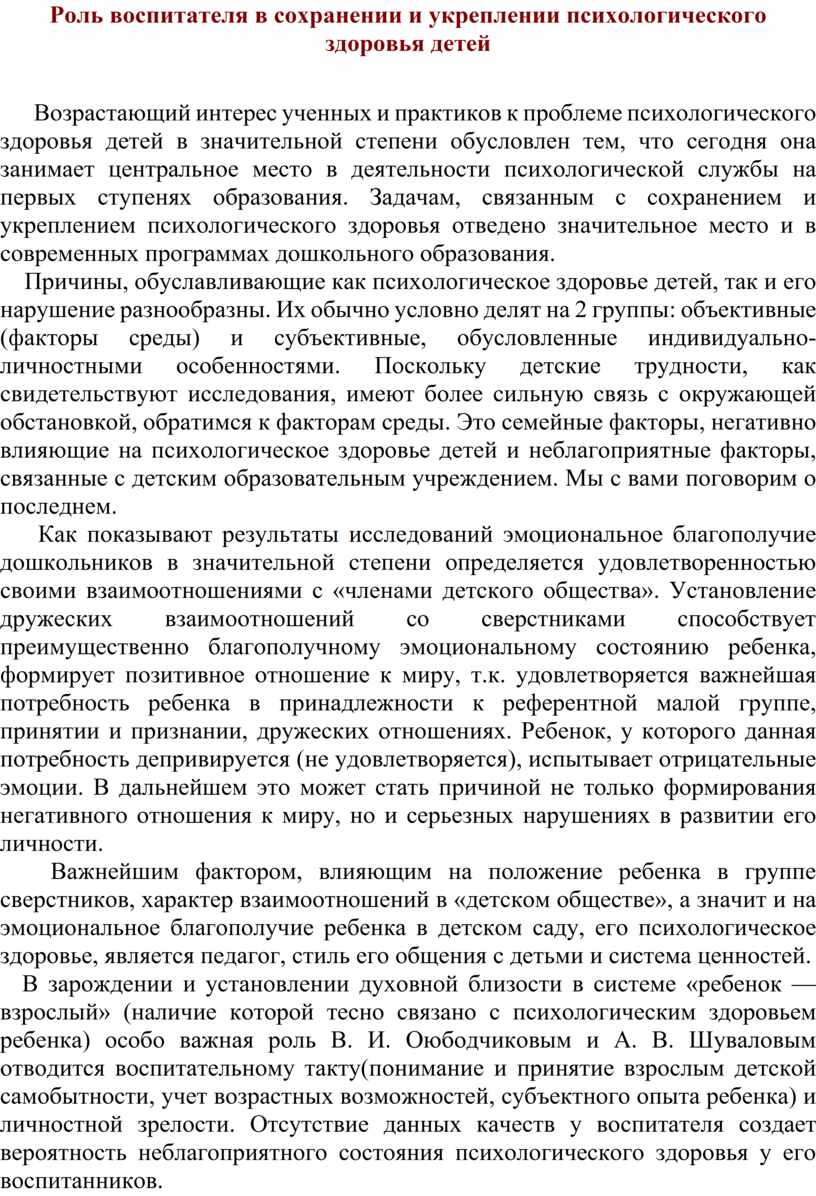 Статья для педагогов " Роль воспитателя в сохранении и укреплении психологического здоровья детей "