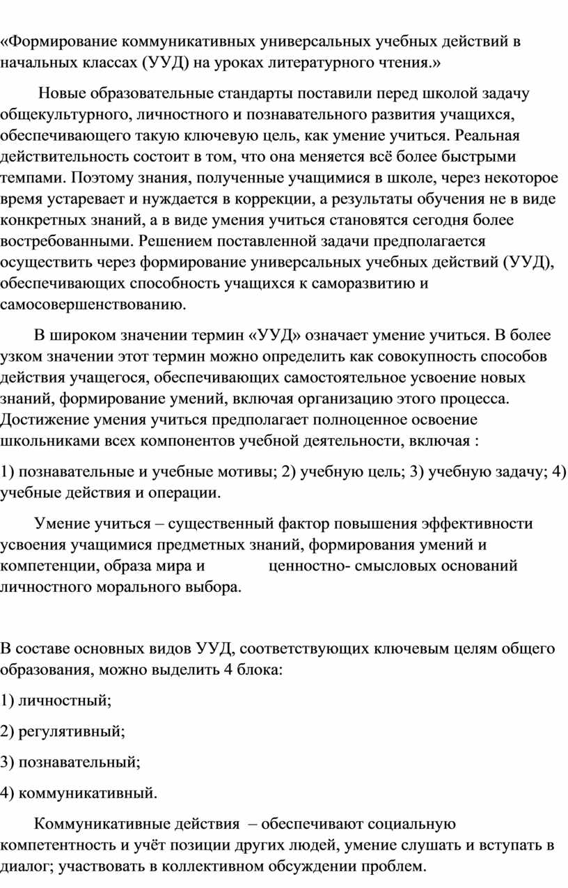 «Формирование коммуникативных универсальных учебных действий в начальных классах (УУД) на уроках литературного чтения.»