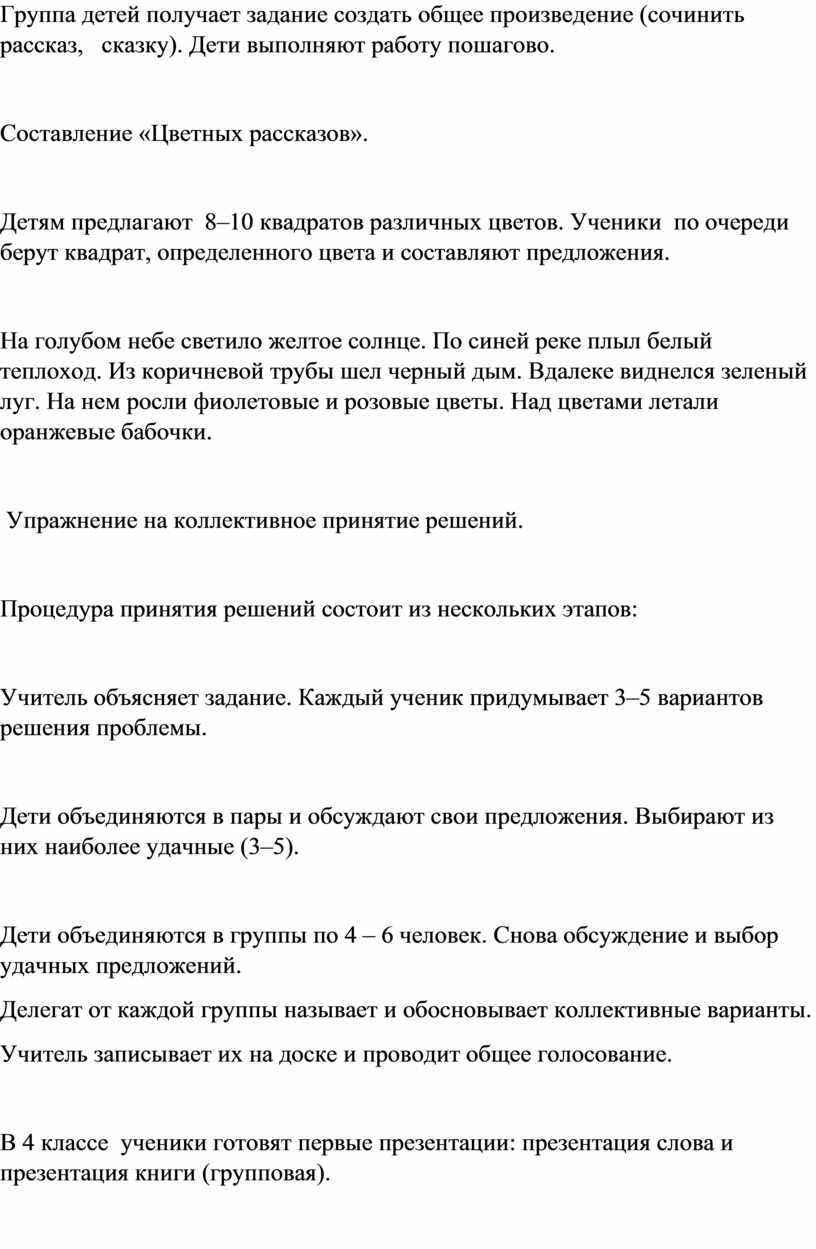 Группа детей получает задание создать общее произведение (сочинить рассказ, сказку). Дети выполняют работу пошагово.
