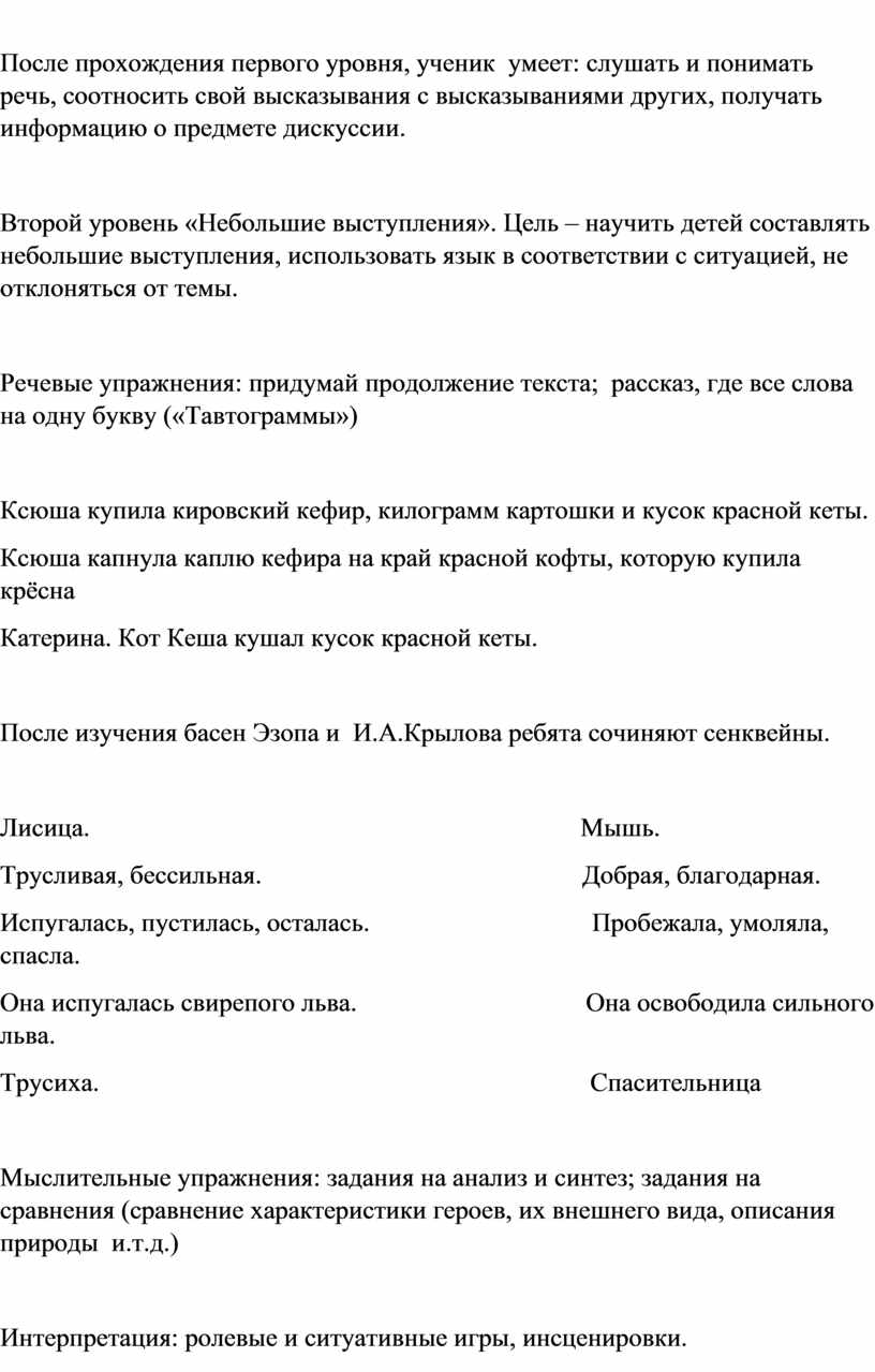 На каждом уровне можно использовать следующие виды упражнений: