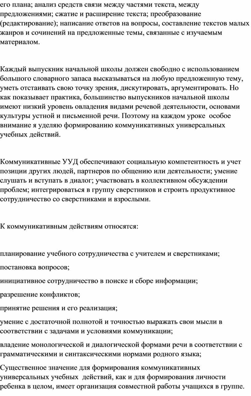Каждый выпускник начальной школы должен свободно с использованием большого словарного запаса высказываться на любую предложенную тему, уметь отстаивать свою точку зрения, дискутировать, аргументировать. Но как показывает практика, большинство выпускников начальной школы имеют низкий уровень овладения видами речевой деятельности, основами культуры устной и письменной речи. Поэтому на каждом уроке особое внимание я уделяю формированию коммуникативных универсальных учебных действий.