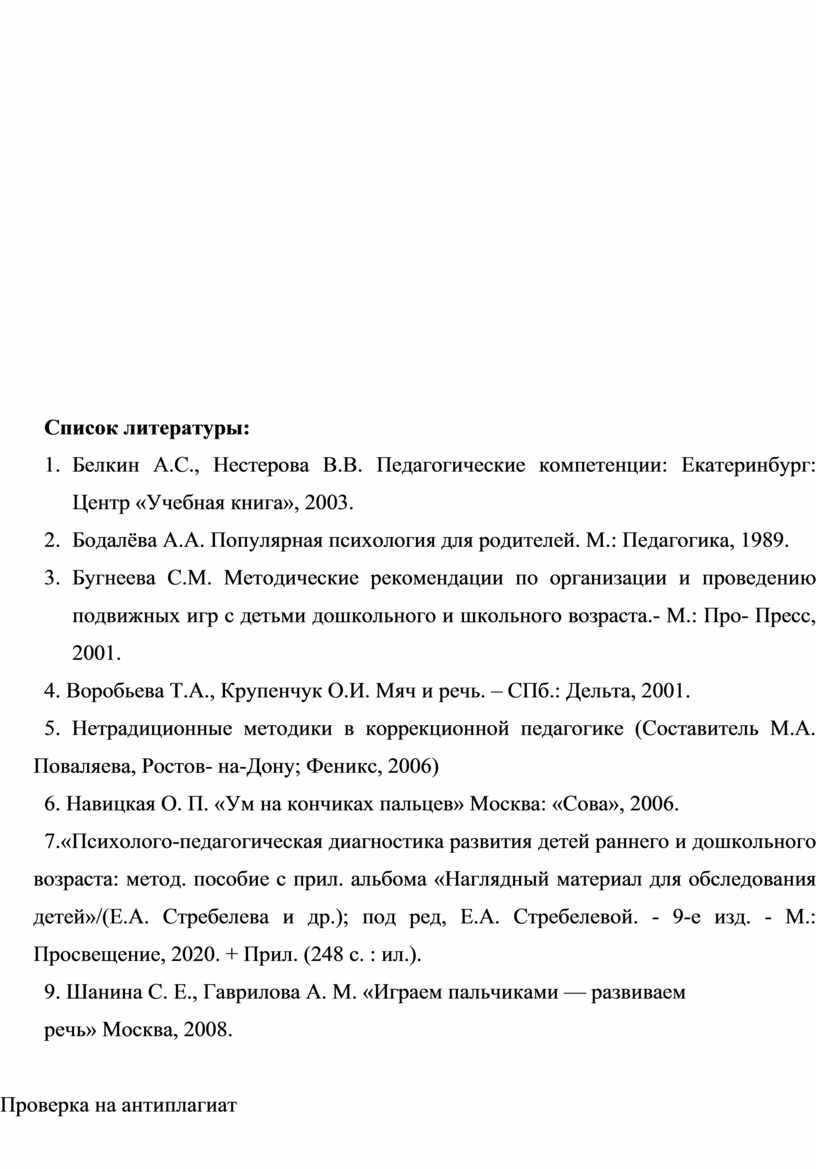 1. Белкин А.С., Нестерова В.В. Педагогические компетенции: Екатеринбург: Центр «Учебная книга», 2003.